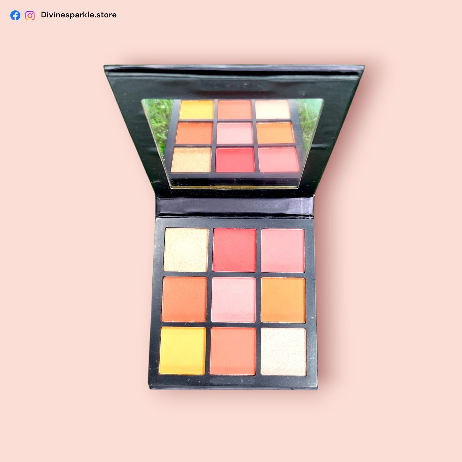 9-shade warm-toned palette with coral, peach & gold hues in matte and shimmer finishes. Pigmented & portable.